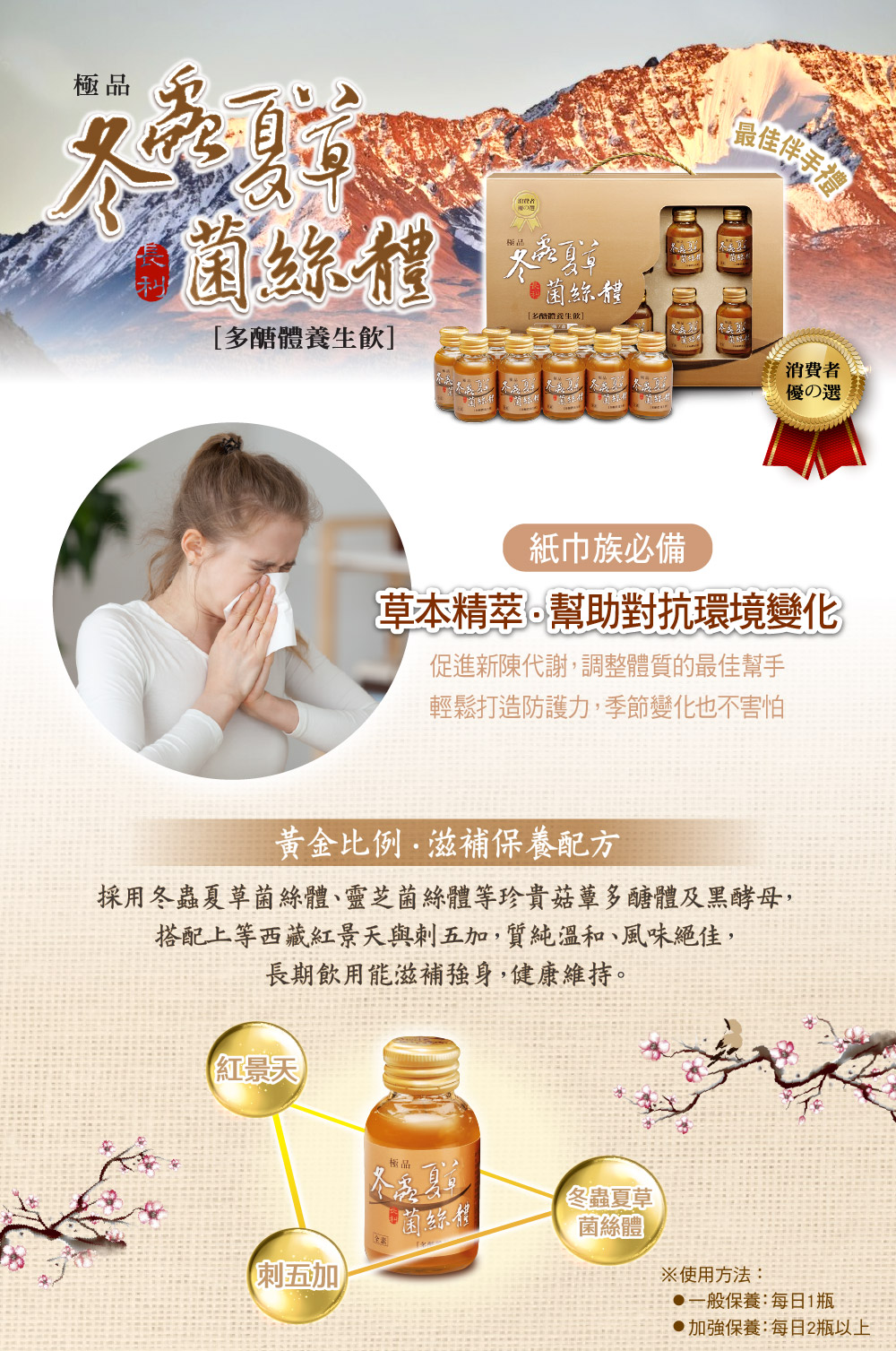 ◆ 冬蟲夏草菌絲體 : 歷代藥典中價值極高的藥材,富含多醣體、麥角固醇及人體所必須的多種胺基酸、蛋白質、脂肪酸、核酸、固醇類、維生素及礦物質等營養素