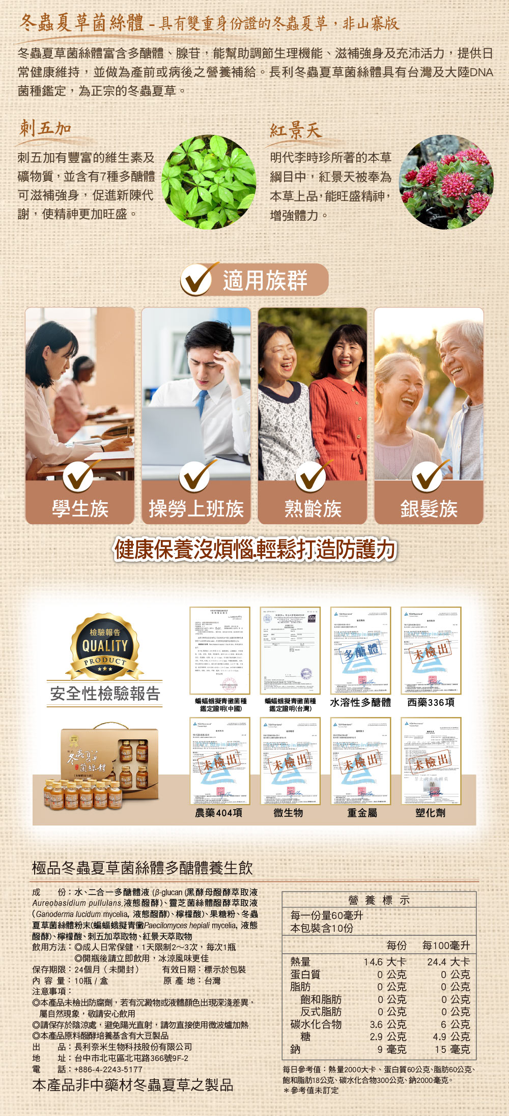 (Ganoderma lucidum mycelia, 液態醱酵)、檸檬酸、果糖粉、冬蟲夏草菌絲體粉末(蝙蝠蛾擬青黴Paecilomyces hepiali mycelia, 液態醱